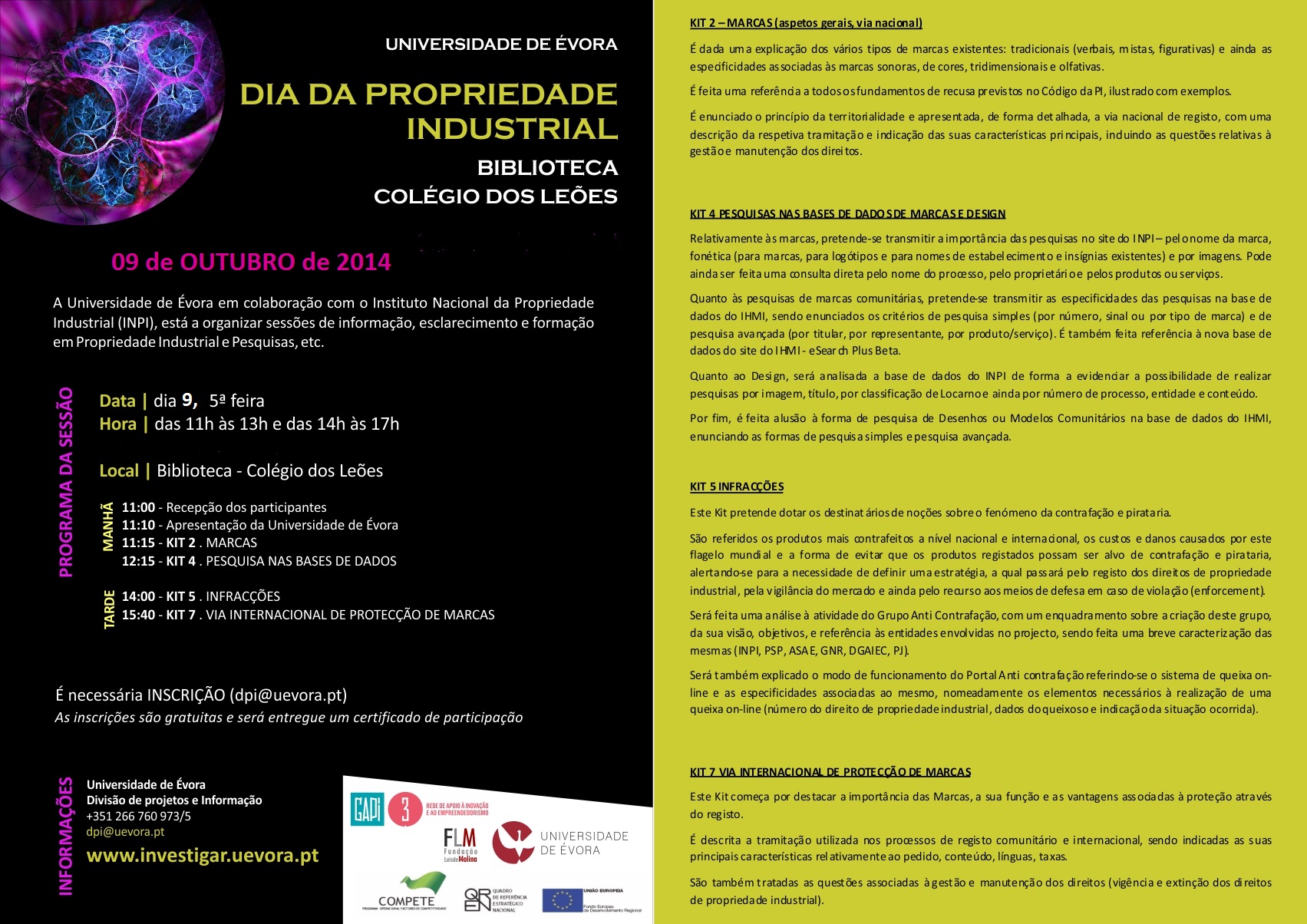 A Universidade de Évora em colaboração com o Instituto Nacional da Propriedade Industrial (INPI), está a organizar sessões de informação, esclarecimento e formação em Propriedade Industrial e Pesquisas, etc.