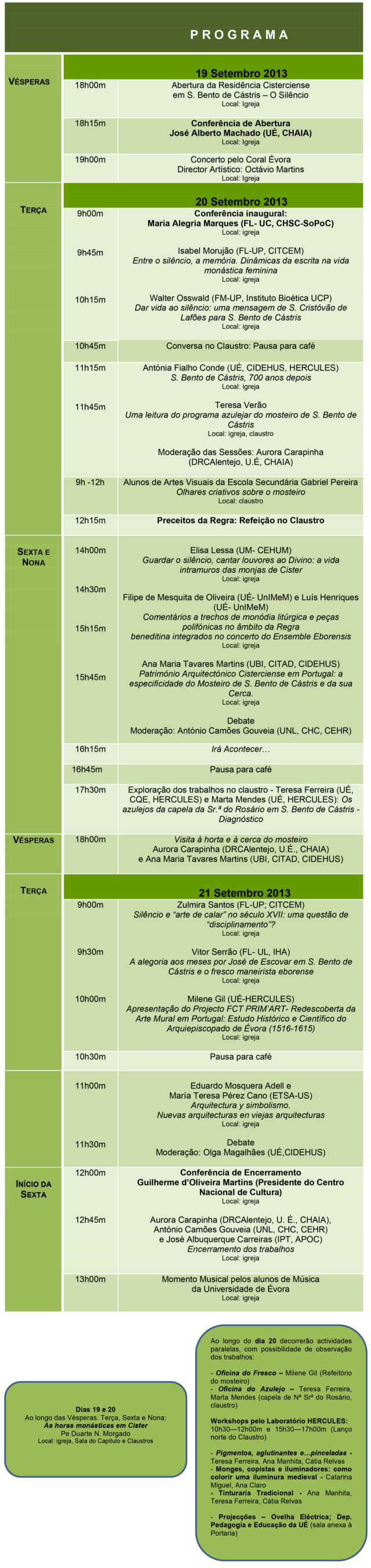 A Residência Cisterciense proposta para o mosteiro de S. Bento de Cástris entre os dias 19 a 21 de Setembro de 2013 tem como objectivo primacial reinventar na contemporaneidade a densidade histórica do discurso cisterciense, integrando a geografia do mosteiro eborense numa mais ampla geografia da Ordem de Cister. Inspirada nas questões da História, da Arte, do Património e da Paisagem cistercienses, a Residência, regida pelo ritmo do quotidiano da Regra beneditina, apostará na vivência dos espaços do mosteiro e no debate de questões actuais ligadas aos espaços monásticos e ao seu futuro, apostando-se no carácter original da iniciativa. O silêncio, as suas linguagens e significados em domínios vários, colorido pelo devir natural dos tempos e espaços do mosteiro, por oficinas exploratórias das potencialidades do mosteiro enquanto vasto espaço patrimonial e por narrativas abertas apelando à criatividade e à contemporaneidade, será o denominador comum da iniciativa