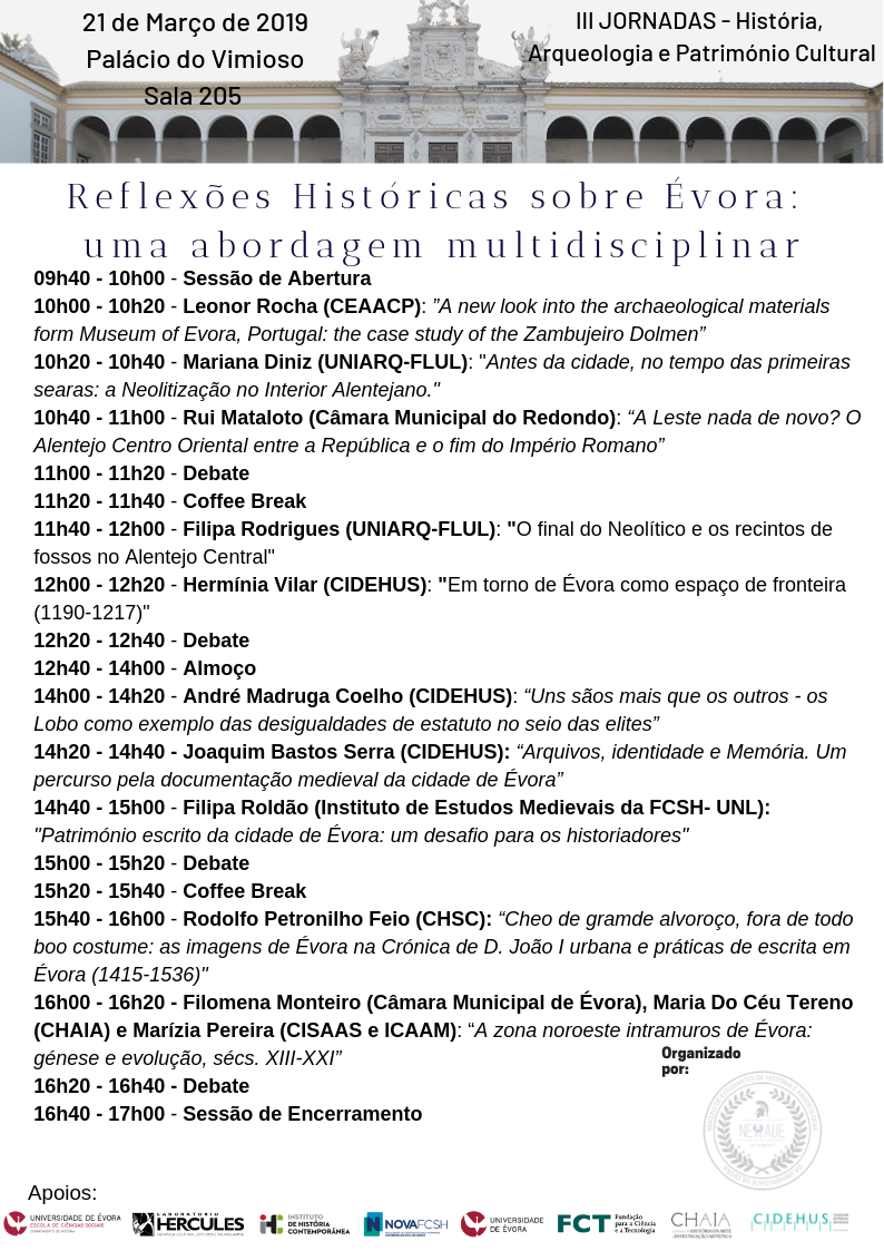 Decorrerão, no dia 21 de Março de 2019, as III Jornadas de História, Arqueologia e Património Cultural da Universidade de Évora.