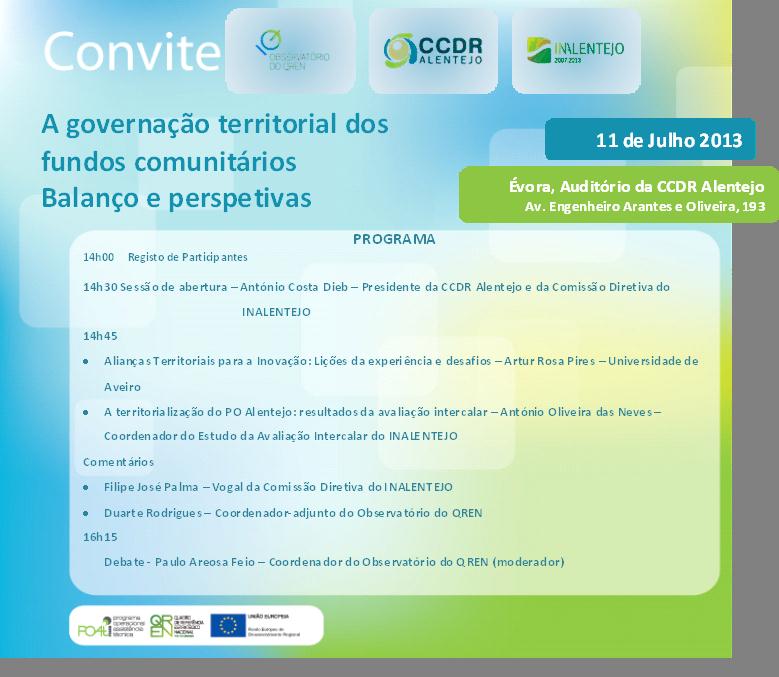 Vimos por este meio convidar V. Exa para participar no workshop sobre A governação territorial dos fundos comunitários Balanço e perspetivas que se realiza no dia 11 de julho de 2013 no Auditório da CCDR Alentejo |