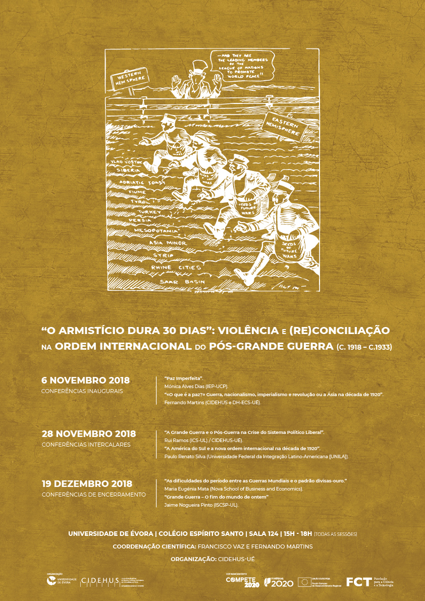 Decorerrá, entre 6 de Novembro e 19 de Dezembro, o Ciclo de Conferências "O Armistício dura 30 dias": violência e (re)conciliação na ordem internacional do pós-Grande Guerra (c. 1918 – c.1933), evocativo do 100º aniversário do fim da Grande Guerra.